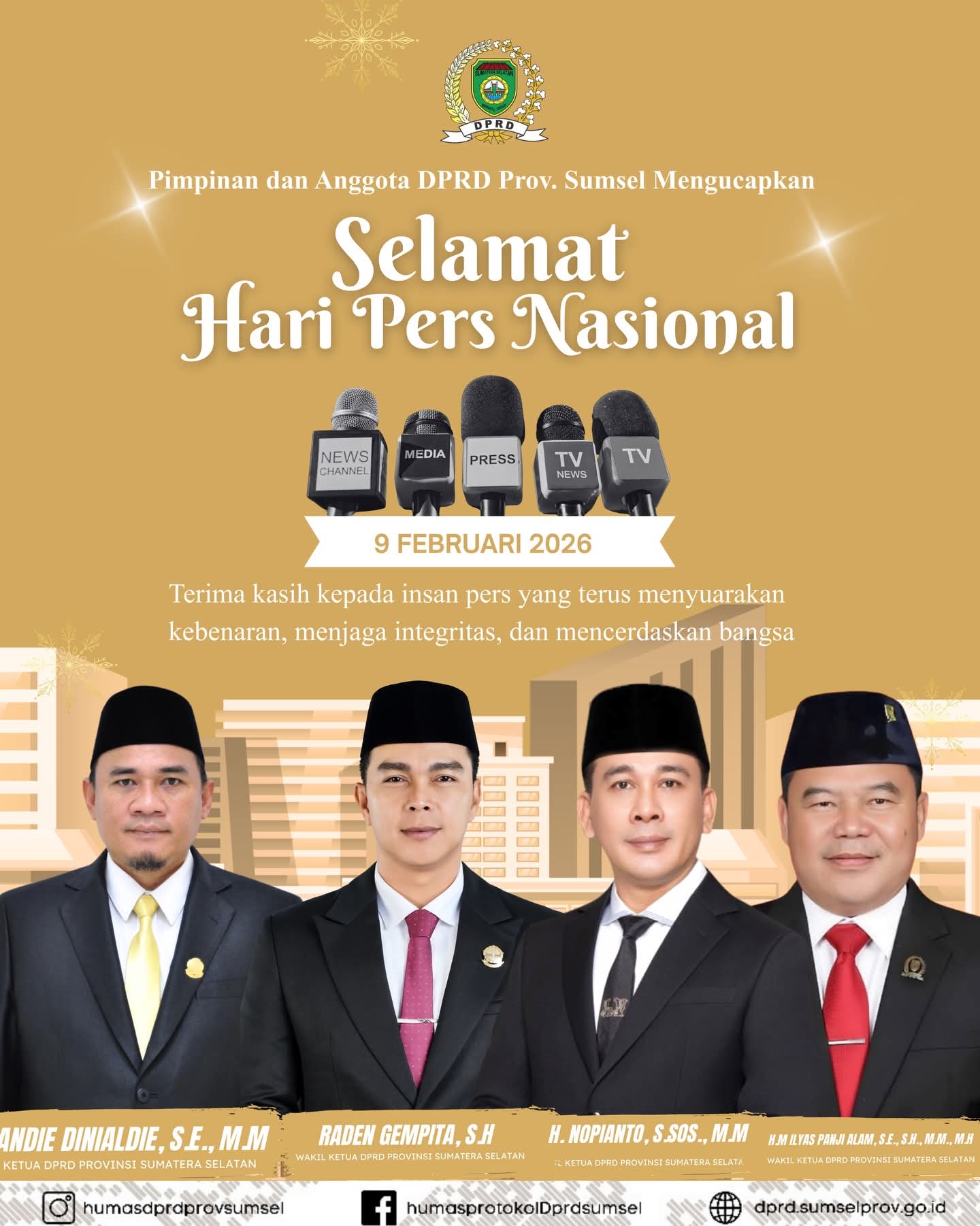 Jajaran Pimpinan dan Anggota Dewan Perwakilan Rakyat Daerah Provinsi Sumatera Selatan (DPRD Sumsel) memberikan apresiasi mendalam kepada seluruh insan pers dalam rangka memperingati Hari Pers Nasional (HPN).